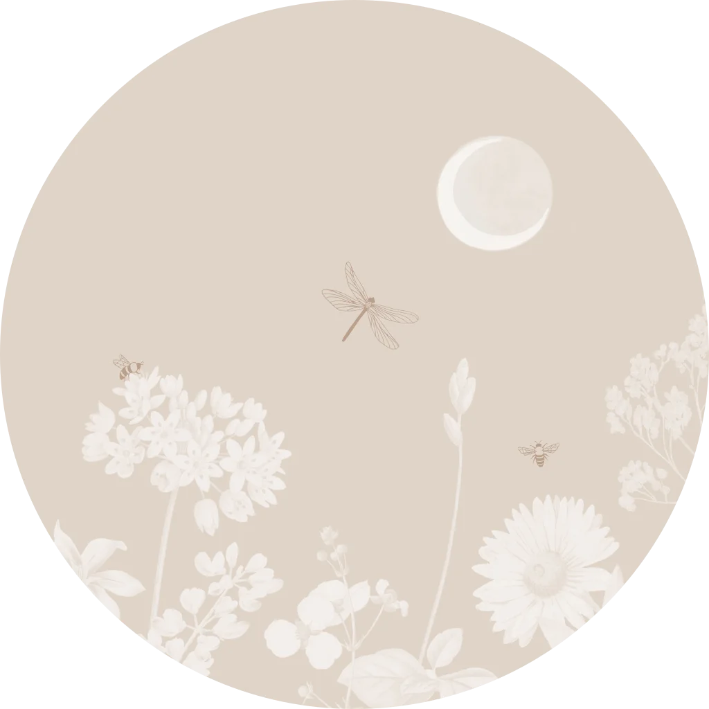 Behangcirkel 120cm lichte wilde bloemen bijtjes libelle maan beige