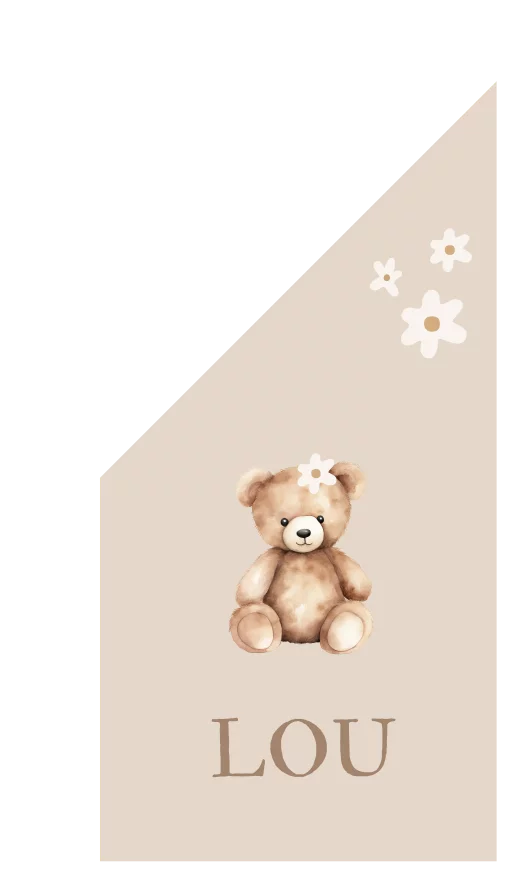 Geboortevlag voor de aankondiging van de geboorte van jullie kindje (een kioskvlag) met een lief aquarel knuffelbeertje en mooie madeliefdjes met een beige achtergrond.