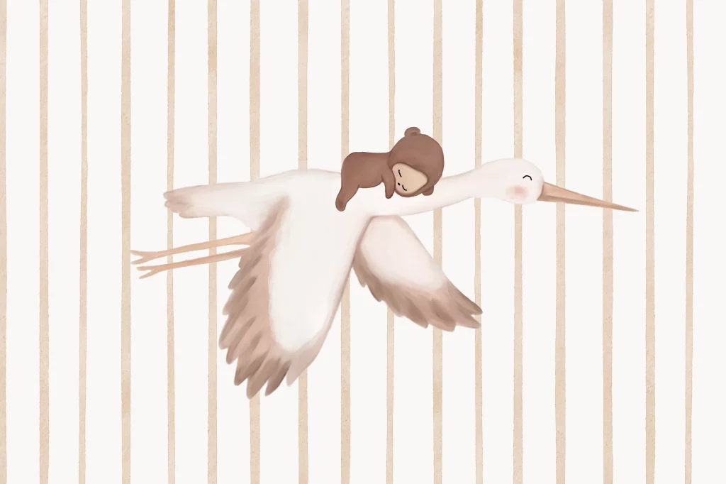 Lieve poster met ooievaar en baby met berenpakje op de rug vliegend. Liggend formaat van 40x60cm. Pas de achtergrondkleur zelf aan naar wens. Liever een ander formaat? Dat kan, stuur een berichtje en wij zetten het voor je om.