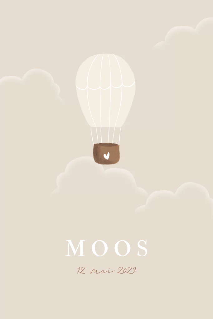 Luxe poster babykamer met een mooie luchtballon in de wolken, waarbij de lijnen van de luchtballon worden gedrukt in goudfolie. Deze poster is 20x30cm en wordt gedrukt op coated karton 240 gram met folie.