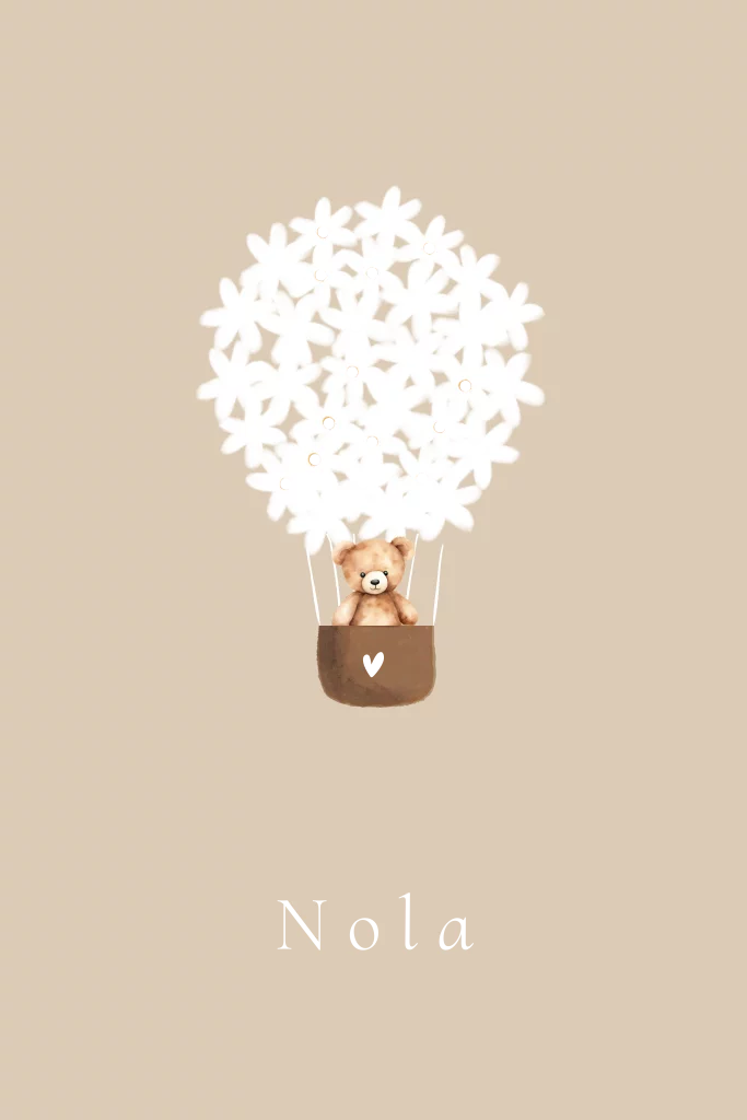 Luxe poster babykamer met een lief knuffelbeertje / teddybeertje vliegend in een madeliefjes luchtballon. De knopjes van de madeliefjes worden gedrukt in goudfolie. Deze poster is 20x30cm en wordt gedrukt op coated karton 240 gram met folie.