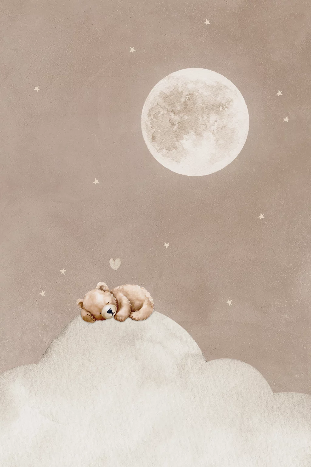 Lieve poster voor op de babykamer met een slapend knuffelbeertje teddybeertje op een wolk met volle maan en sterren. Liever een ander formaat? Wij helpen je graag!