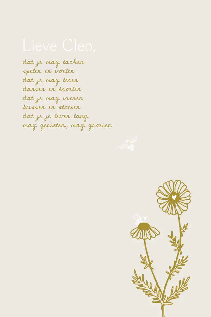 Deze poster is supergaaf op de babykamer (of kinderkamer). De twee bijtjes, 'lieve cleo' en een subtiel hartje onder het gedichtje worden gedrukt in goudfolie.