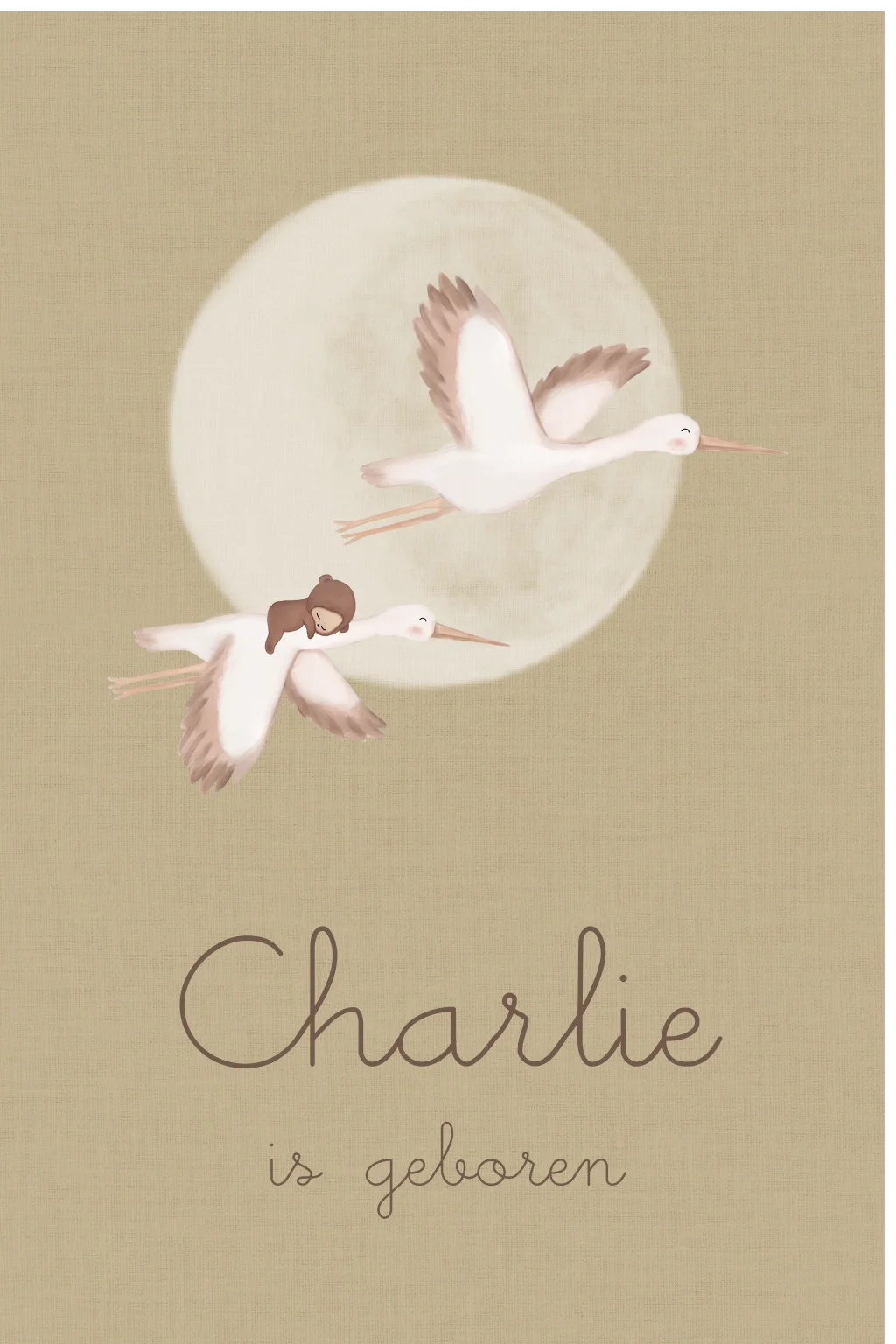 Mooi geboorte raambord met twee ooievaars vliegend voor een volle maan met een kindje op de rug met berenpakje. Pas gemakkelijk de kleuren en de naam aan in de handige editor!
