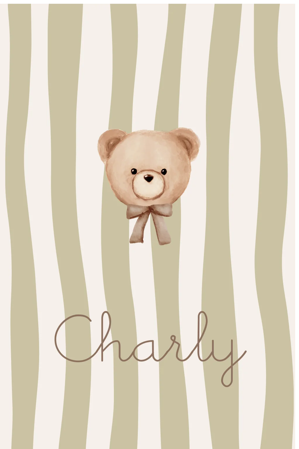 Stoer geboortebord met een hip streepjes achtergrond en een teddybeertje met strikje. Pas gemakkelijk de kleuren en de naam aan in de handige editor!