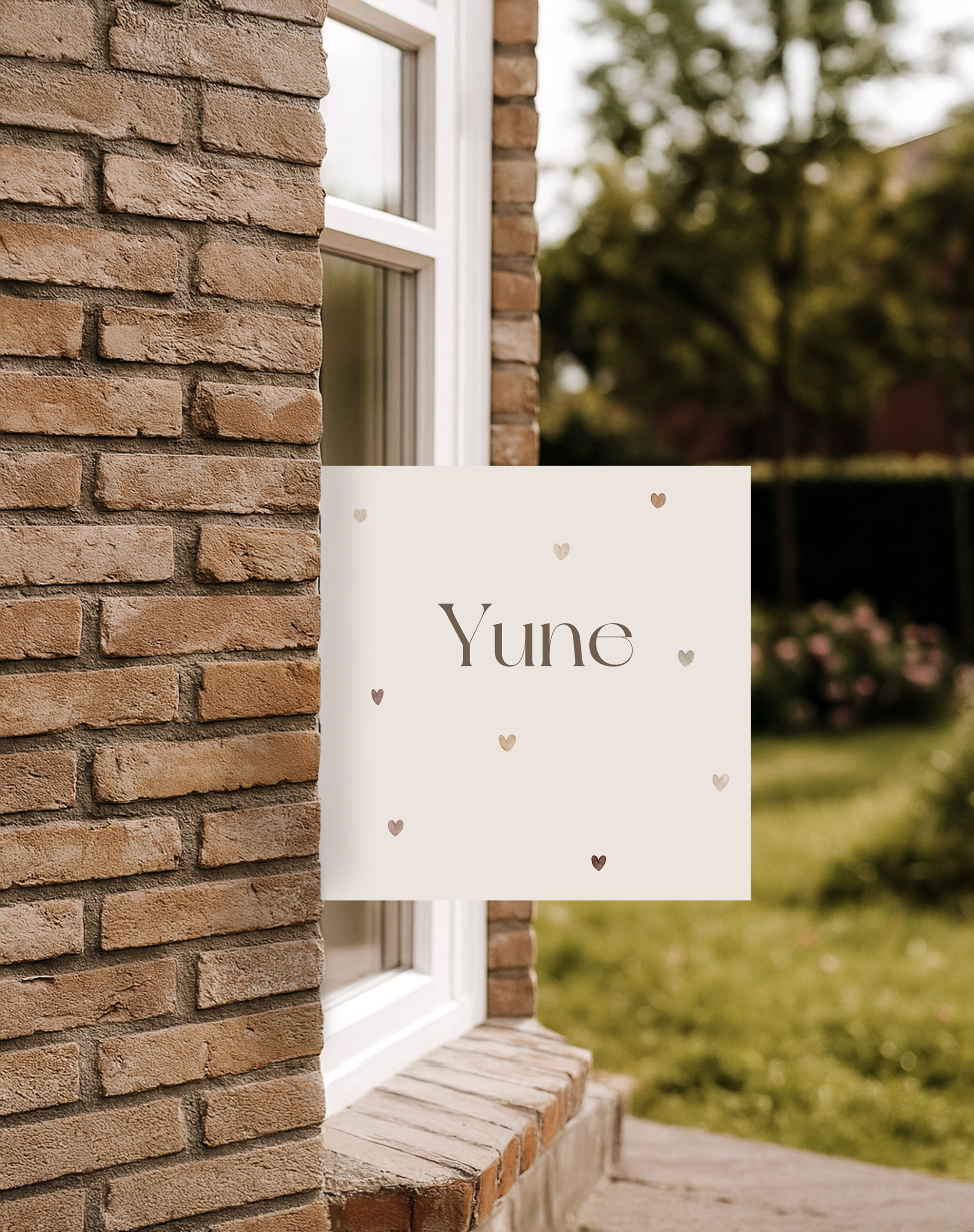Lief geboorte raambord met hartjes in beige en taupekleuren. Pas gemakkelijk de achtergrondkleur en/of kleur van de naam aan in je gewenste kleuren. Tip: bestel dit bord al van tevoren zonder geboortedatum, zo kun je het raambord meteen opplakken zodra je/jullie kindje is geboren!