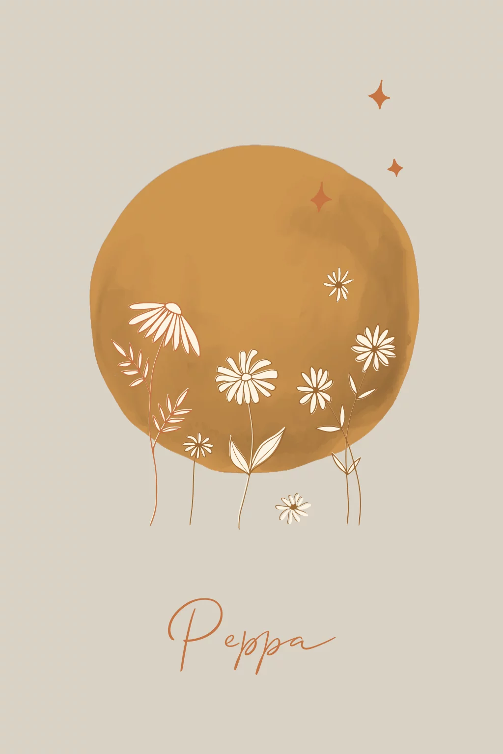 Raamsticker voor de geboorteaankondiging van jullie kindje op het raam met grote volle maan en bloemetjes. Pas de sticker aan naar de naam van jouw kindje en kleuren van de babykamer. Heb je hulp nodig of wil je een ander ontwerp bijpassend aan het geboortekaartje? Wij helpen je graag!