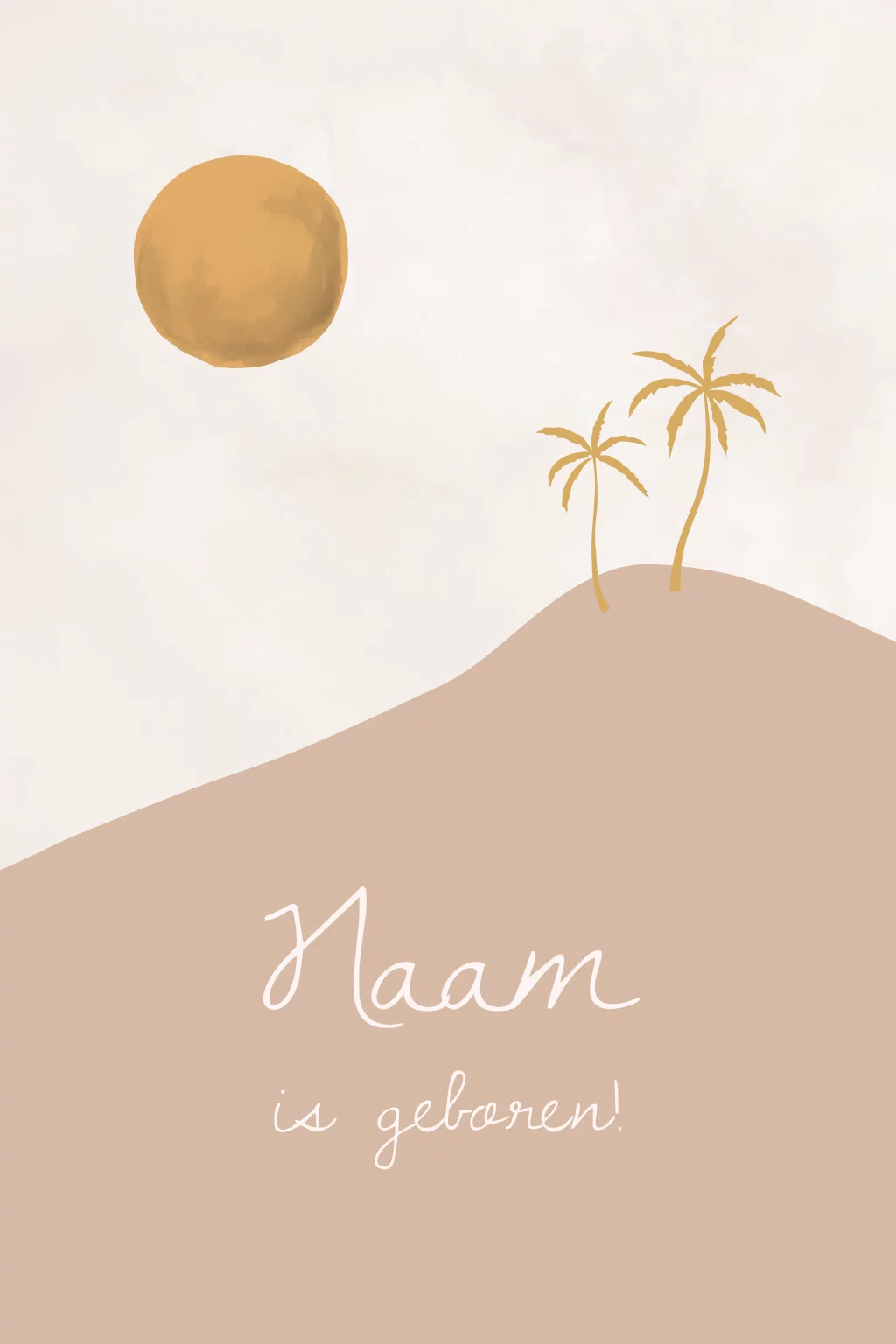 Laat aan de buurt zien dat je kindje geboren is met deze mooie raamsticker met woestijnlandschap, palmbomen en volle maan. Het ontwerp kun je eenvoudig bewerken. Je bevestigt jouw raamsticker heel gemakkelijk aan de binnenkant van je raam.