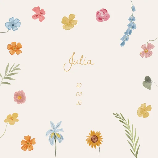 Lief geboortetegeltje met zomerse handgetekende bloemen in kleur. Pas de kleuren, naam allemaal naar wens aan in de handige online editor! Hulp nodig met opmaken of wil je dit tegeltje precies zo als je geboortekaartje? Dat kan, stuur ons vrijblijvend een berichtje en wij zetten het gratis om voor je in je account.