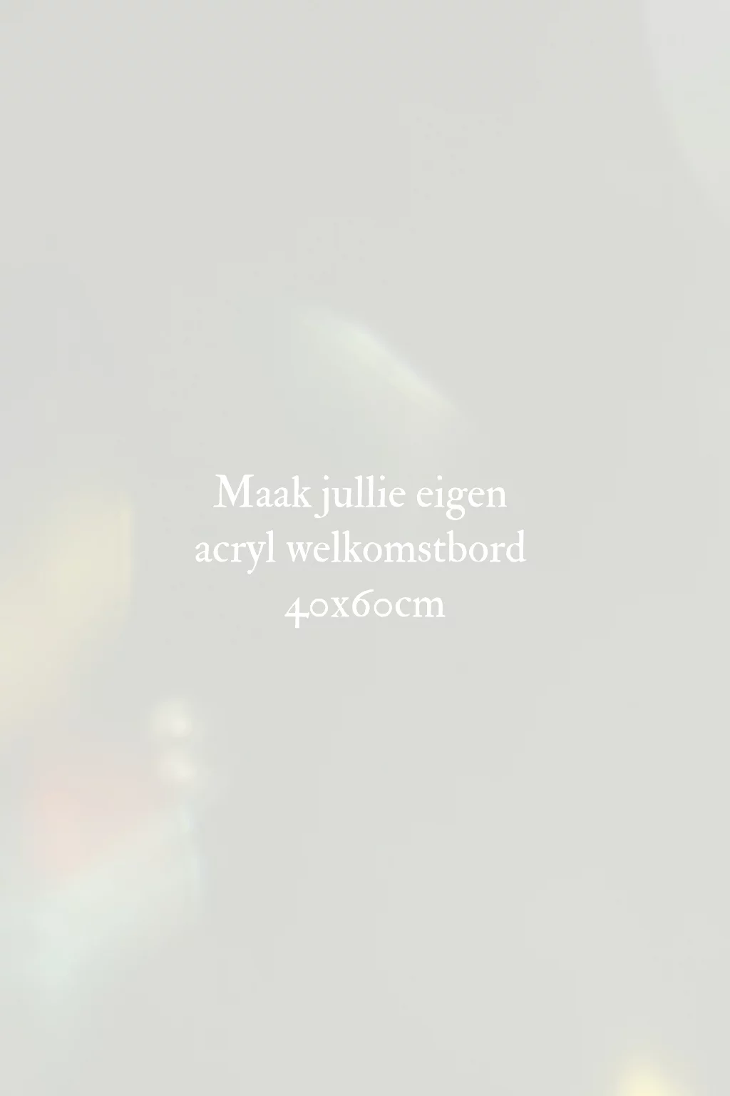 Maak zelf een mooi welkomstbord voor jullie bruiloft met dit blanco bord op transparant acryl/plexiglas. Het bord is 40x60cm. Hulp nodig? Wij helpen je altijd graag!