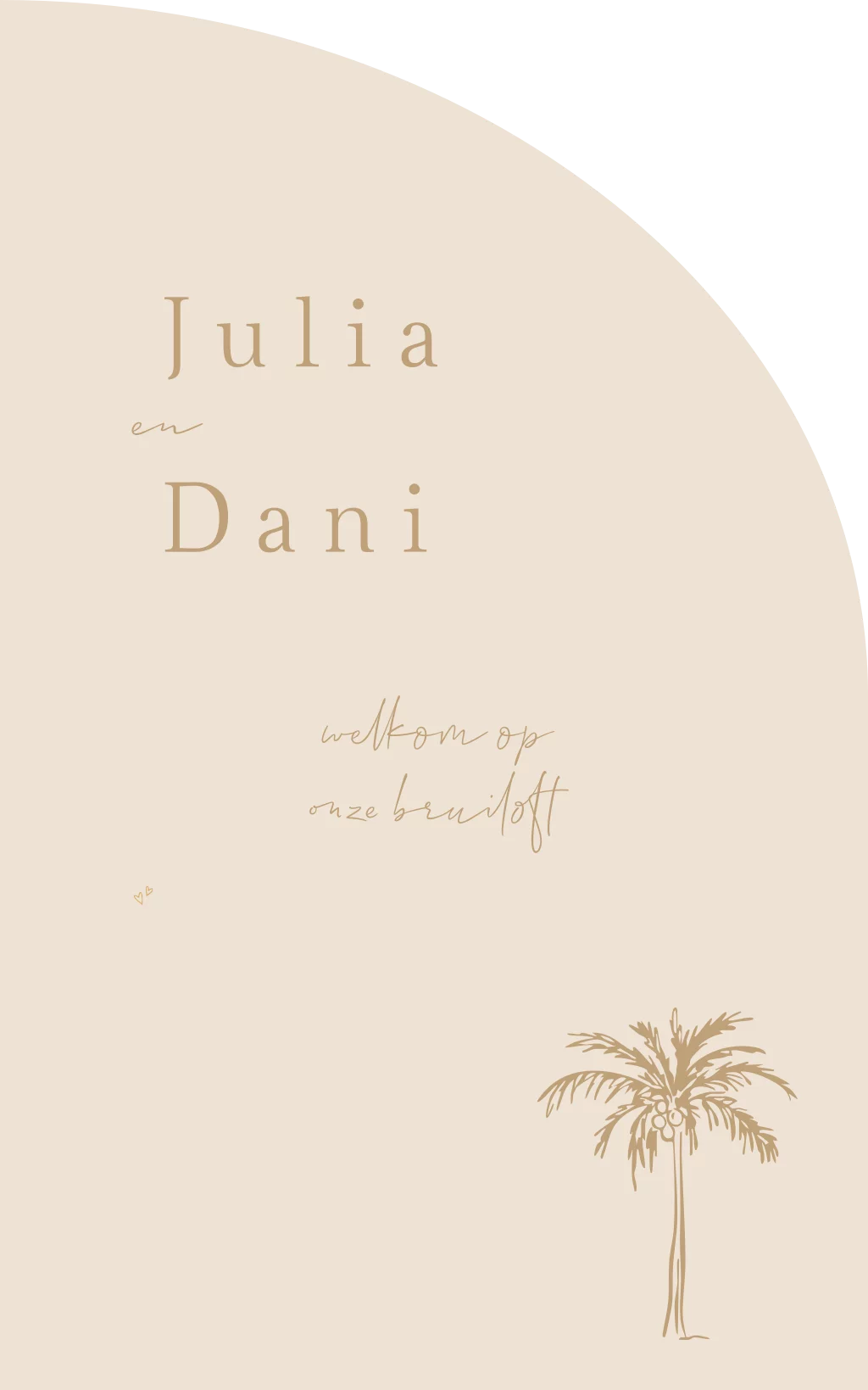 Mooi halve boog bruiloftsbord met zandkleuren en een palmboom voor een zomerse bruiloft.