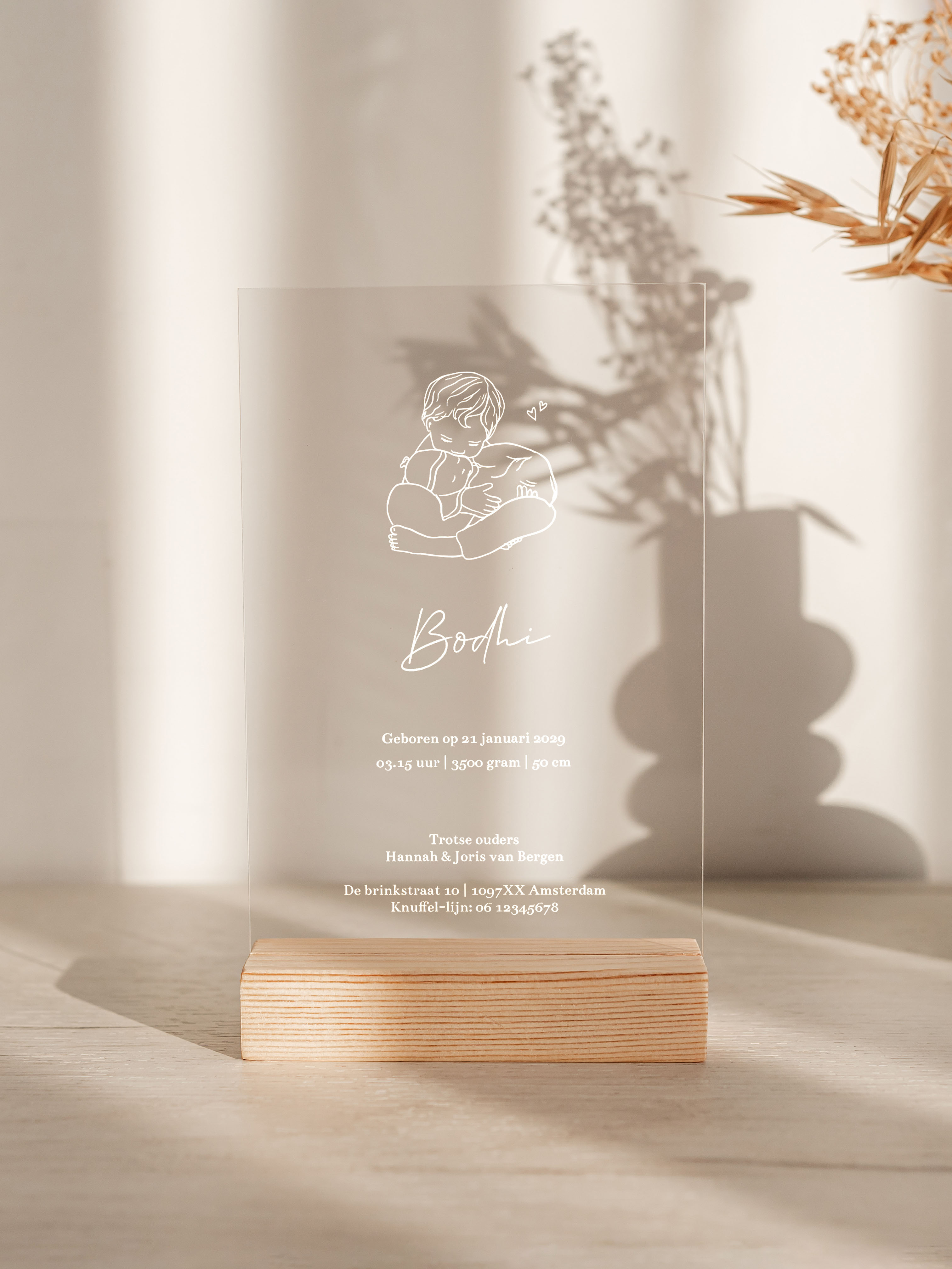 Dit bijzondere geboortekaartje wordt gedrukt op plexiglas (acryl) en is 2mm dik en heeft een afmeting van 11x17cm. Doordat het kaartje transparant is, kun je alleen 1 kant van het kaartje bedrukken. Dit kaartje staat nu in geheel in wit, maar je kunt gemakkelijk een kleur toevoegen! Achtergrondkleur is niet aan te raden.