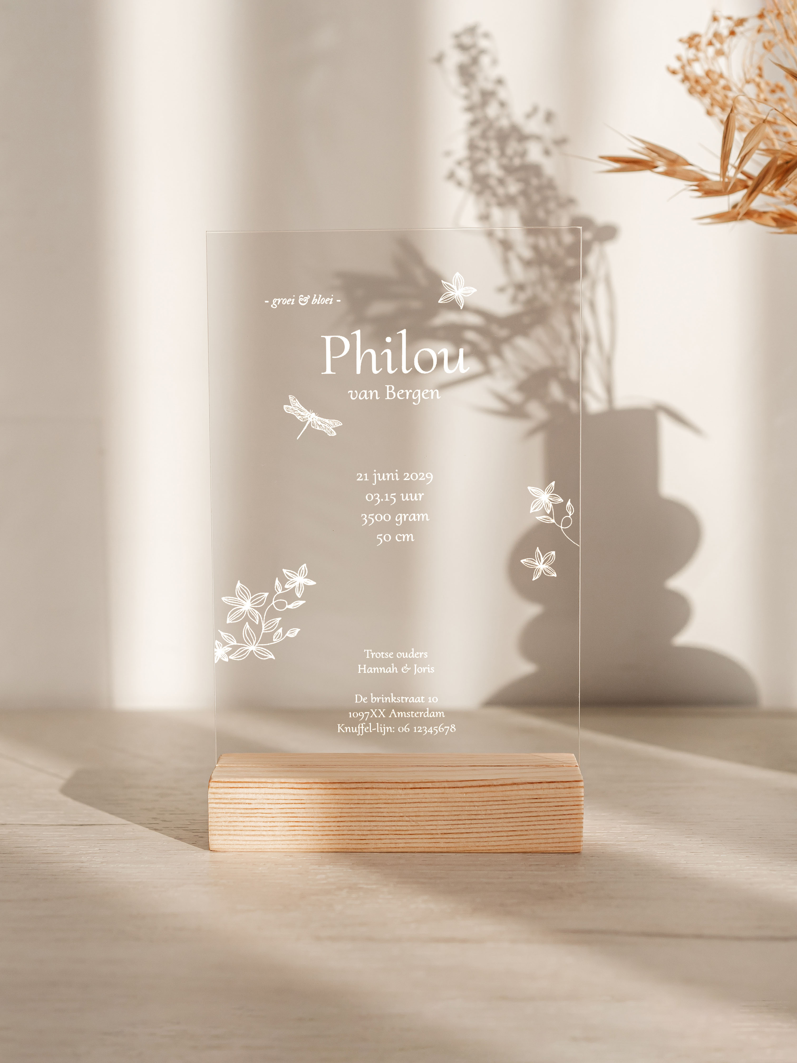 Dit bijzondere geboortekaartje wordt gedrukt op plexiglas (acryl) en is 2mm dik en heeft een afmeting van 11x17cm. Doordat het kaartje transparant is, kun je alleen 1 kant van het kaartje bedrukken. Dit kaartje staat nu in geheel in wit, maar je kunt gemakkelijk een kleur toevoegen! Achtergrondkleur is niet aan te raden.