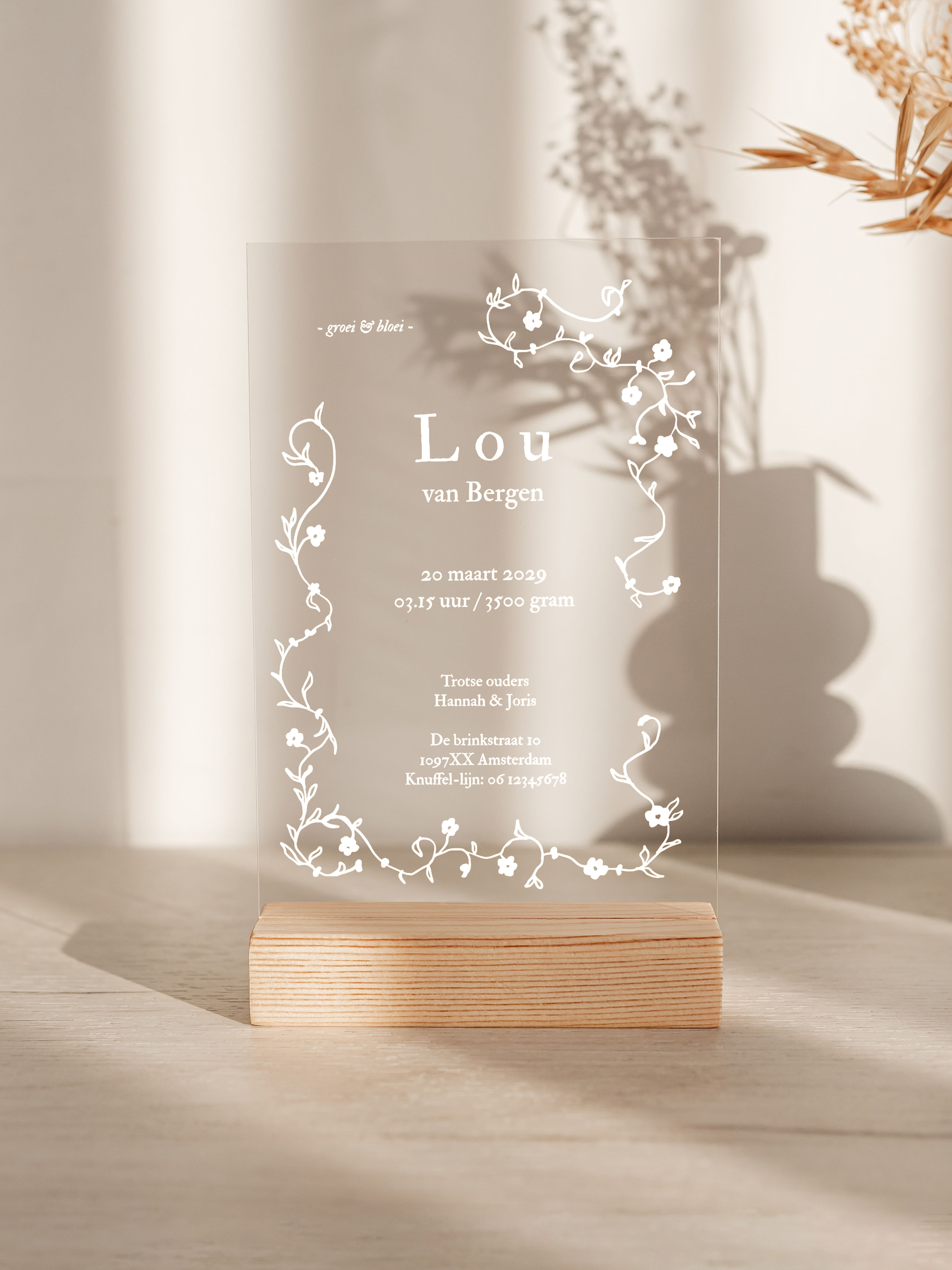 Dit bijzondere geboortekaartje wordt gedrukt op plexiglas (acryl) en is 2mm dik. Doordat het kaartje transparant is, kun je alleen 1 kant van het kaartje bedrukken. Dit kaartje staat nu in geheel in wit, maar je kunt gemakkelijk een kleur toevoegen! Achtergrondkleur is niet aan te raden.