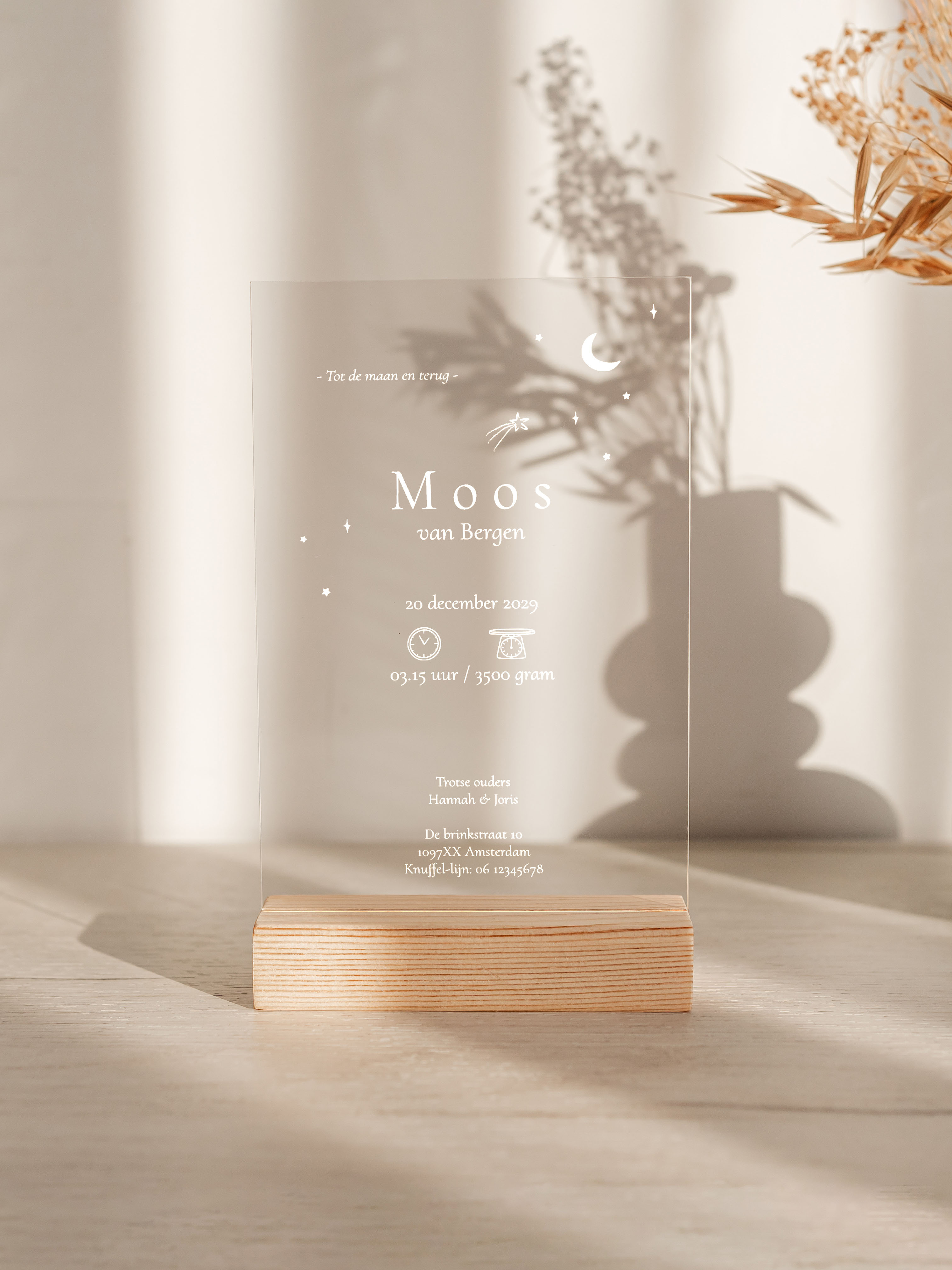 Acryl plexiglas 2mm geboortekaartje wit maan vallende ster 11x17cm