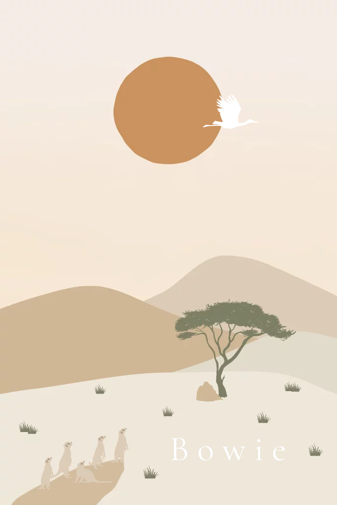 Prachtig afrikaans thema geboortekaartje met stokstaartjes die kijken in de lucht naar de ooievaar. Het afrikaans landschap schemert door tot de termietenheuvel, de acaciaboom en de stokstaartjes op de heuvel. Kies bijvoorbeeld uit de editor nog een giraft en/of olifant en/of andere afrikaanse dieren. Hulp nodig bij opmaken? Wij helpen je graag verder!