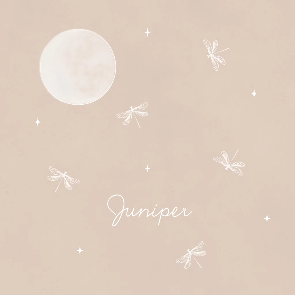 Een lief geboortekaartje met volle maan, sterren en libelles die rond de maan vliegen. De babynaam en sterren worden gedrukt in goudfolie. Je kunt altijd de kleuren aanpassen in de handige editor.
