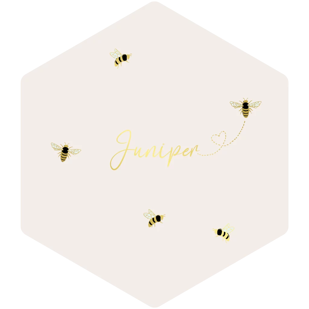 De vorm past perfect bij het ontwerp; een unieke vorm bijenraat geboortekaartje met bijtjes in goudfolie. De babynaam, hartje en de belijning van de bijtjes worden gedrukt in folie.
