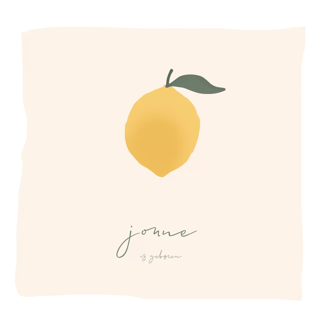 Neutraal vierkant geboortekaartje met handgetekende citroen in speels kader.