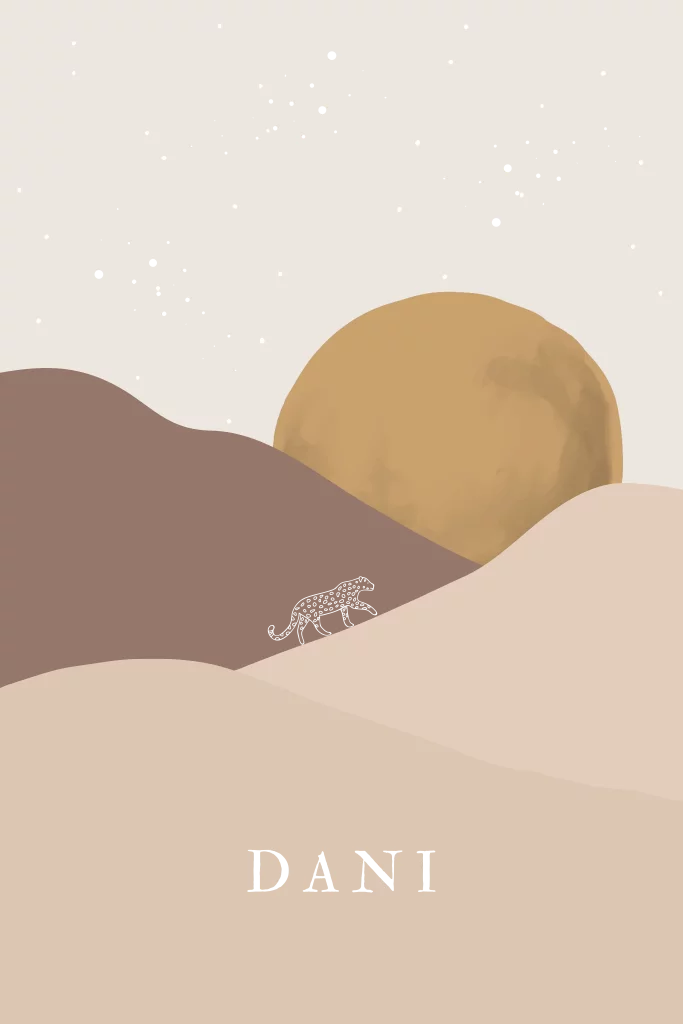 Stoer neutraal geboortekaartje in aardetinten met een prachtige volle maan en sterren. De panter wordt in goudfolie gedrukt (je kunt zelf een dier uitkiezen uit de editor). Voorop de kaart is het nacht en achterop de kaart de zon op, een kaartje met een verhaal:)