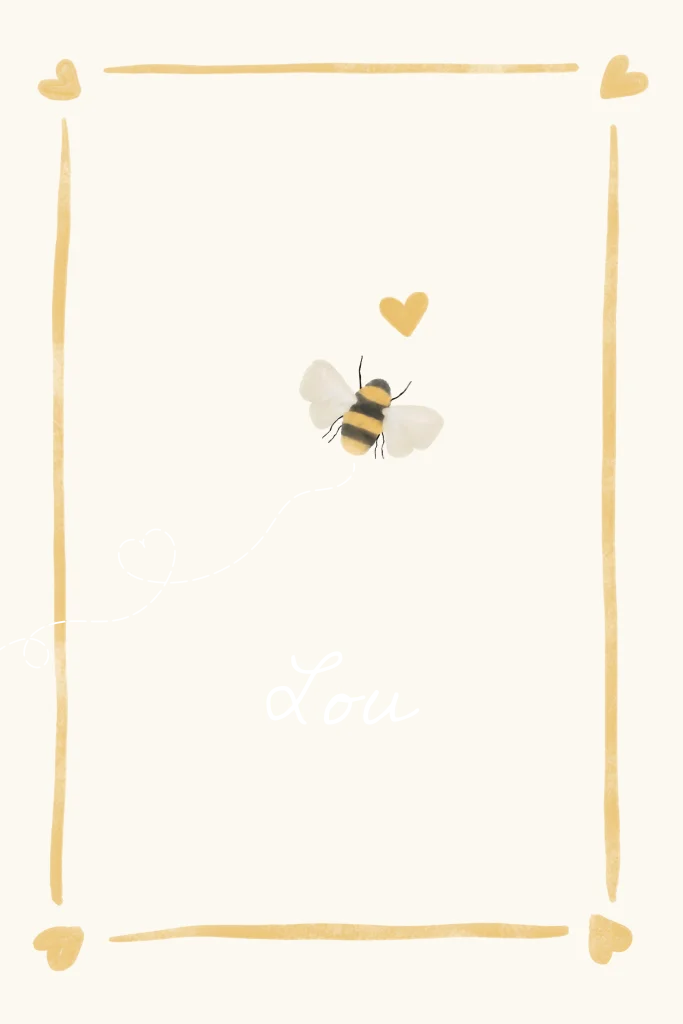 Stoer en lief geboortekaartje met een aquarel handgetekend bijtje met goudfoliedetails. Pas gemakkelijk de kleuren en/of folie aan, net zoals al jouw gegevens op dit kaartje. Wil je deze kaart in een ander formaat/vorm of dubbele kaart? Stuur ons een berichtje en wij helpen je graag verder!