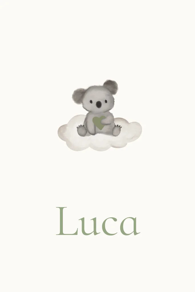 Heel gaaf, dit lieve minimalistische geboortekaartje met een illustratie van een aquarel koalaknuffelbeertje die een hartje vasthoudt zittend op een wolk. Pas gemakkelijk de kleur folie, achtergrond en/of hartje naar wens en smaak aan, heb je hulp nodig of vragen - wij helpen je graag!
