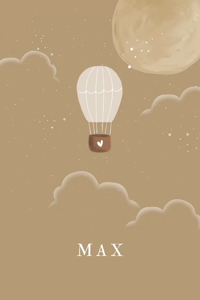 Beige geboortekaartje met een aquarel luchtballon, een volle maan, sterretjes en wolken. De luchtballon touwen, hartje op het mandje van de luchtballon en sommige sterretjes worden gedrukt in goudfolie voor een extra mooi 3D effect!