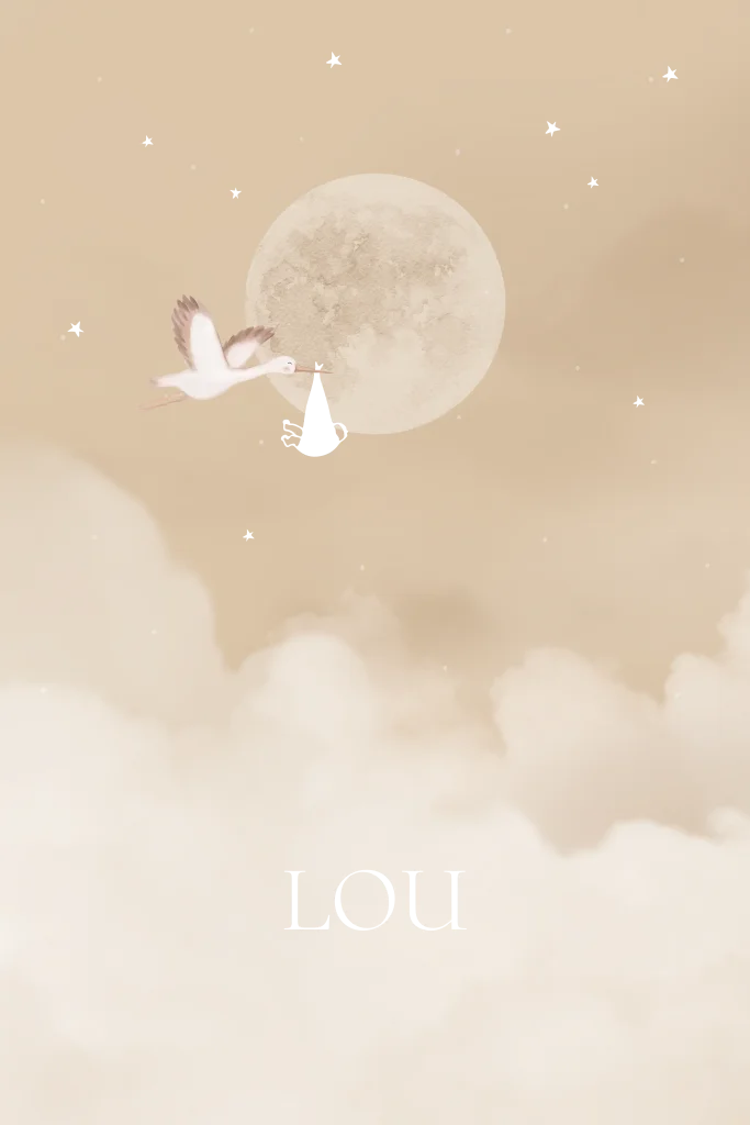 Lief geboortekaartje in de wolken met een aquarel ooievaar en volle maan. Het zakje met kindje wordt gedrukt in goudfolie, net zoals de sterren en naam. Pas de achtergrondkleur gemakkelijk aan. Je kunt altijd om hulp vragen als je er niet uitkomt! Wij helpen je graag!