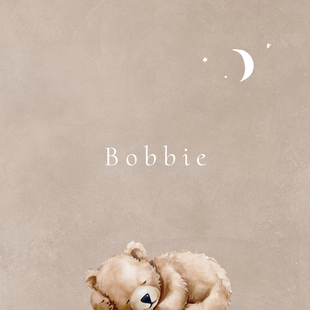 Lief geboortekaartje met een schattig aqaurel slapend knuffelbeertje. De naam en maan met sterretjes worden gedrukt in goudfolie voor dat extra 'wouw' effect. Pas de achtergrondkleur gemakkelijk naar wens aan in de handige editor. Heb je hulp nodig met opmaken of wil je dit ontwerp in een ander vorm of formaat kaart, stuur dan een berichtje - wij helpen je graag!