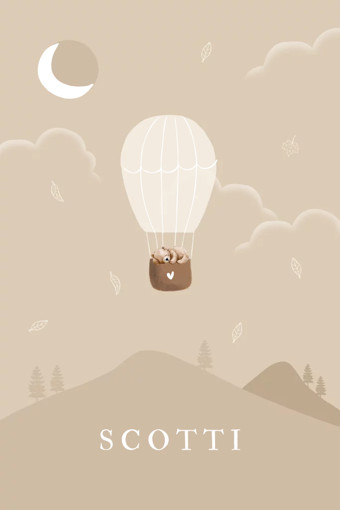 Herfst geboortekaartje met een aquarel luchtballon en knuffelbeertje slapend in het mandje, een volle maan en wolken in de dwarrelende blaadjes. De luchtballon touwen en hartje op het mandje worden gedrukt in goudfolie voor een extra mooi 3D effect! Zet gemakkelijk een ander diertje in het mandje mbv de afbeeldingen in de editor! Hulp nodig of specifieke wensen? Wij helpen je graag!