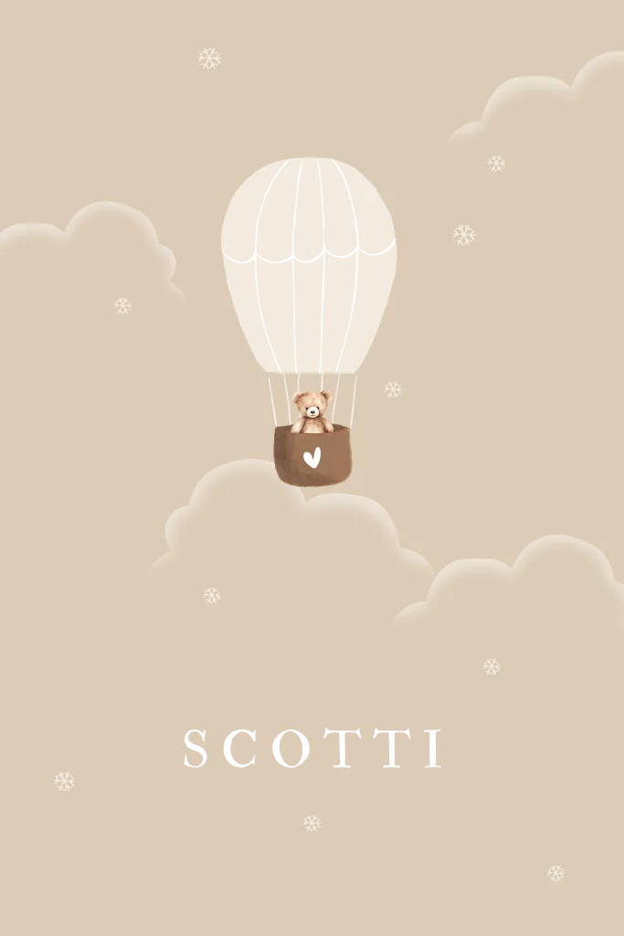 Winters geboortekaartje met een aquarel luchtballon mandje en ijsbeertje, een volle maan en wolken in de sneeuw. De luchtballon touwen, sneeuw en hartje op het mandje worden gedrukt in goudfolie voor een extra mooi 3D effect!