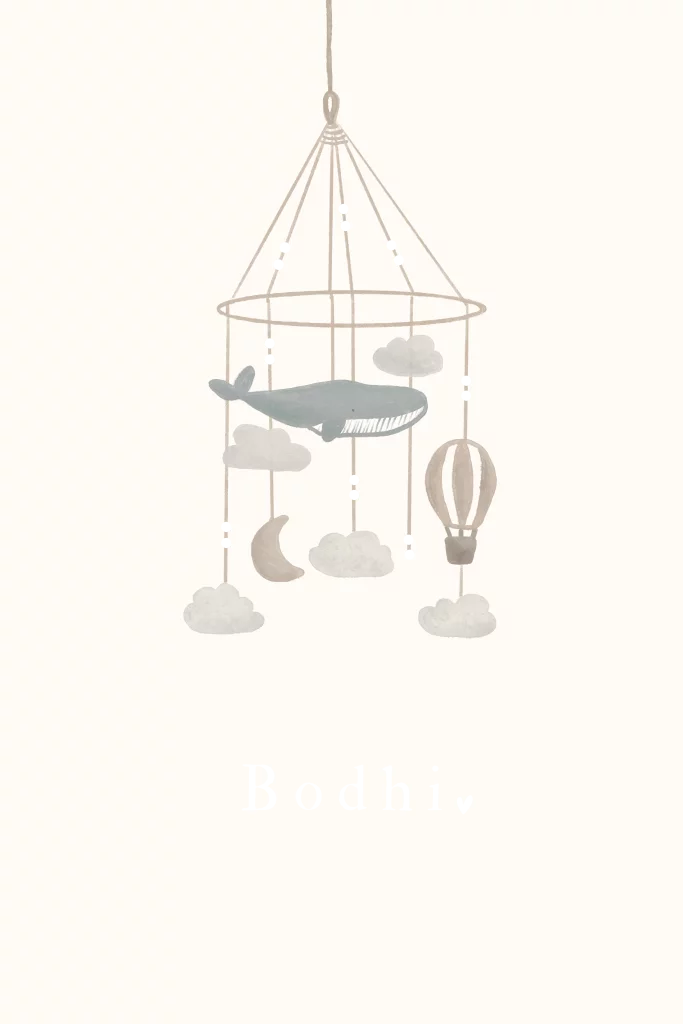 Minimalistisch geboortekaartje met aquarel speelmobiel met wolkjes, maan, walvis en luchtballon. De bolletjes die aan de mobiel hangen worden gedrukt in goudfolie voor een lief speels effect.
