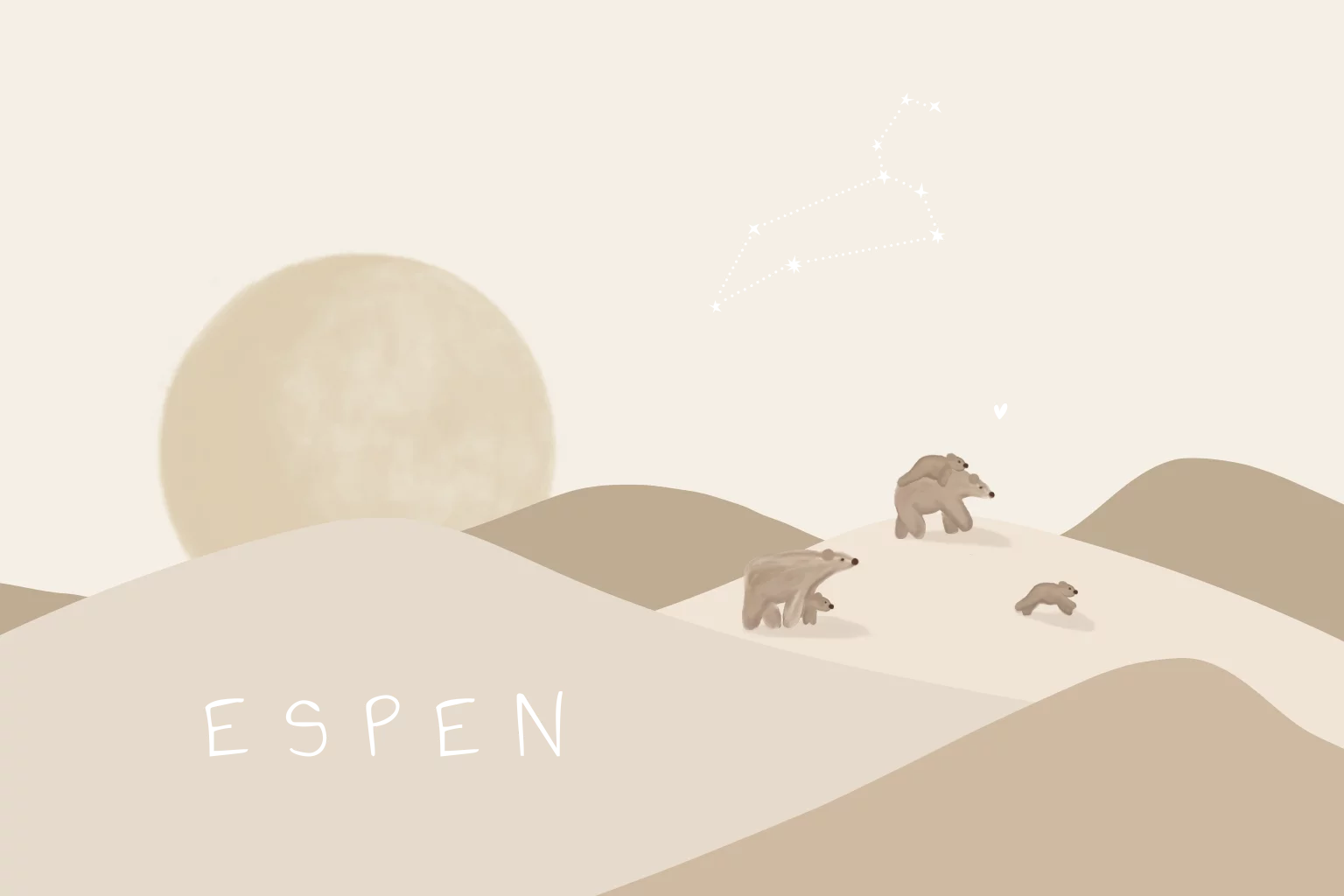 Mooi aquarel geboortekaartje met een mooi berglandschap, bomen, een grote volle maan, sterrenbeeld en een berenfamilie. Het kaartje is mooi afgewerkt met goudfolie details.
