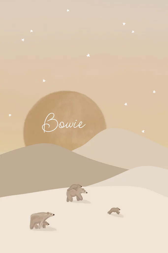 Prachtig berglandschap geboortekaartje met een ondergaande zon of maan en sterren en een berenfamilie. Andere gezinssamenstelling of een dubbele kaart of ander formaat? Wij helpen je graag verder, stuur vrijblijvend een berichtje!