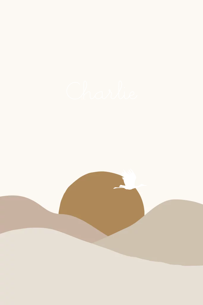 Geboortekaartje met bergen ondergaande zon en ooievaar in goudfolie