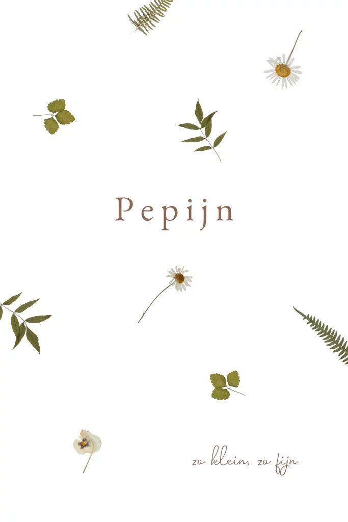 Geboortekaartje met droogbloemen en droogtakjes in eco-look. Tip, bestel dit kaartje op valorise of tulpenbollenpapier (of een andere eco/duurzaam papiersoort) voor een gaaf effect!