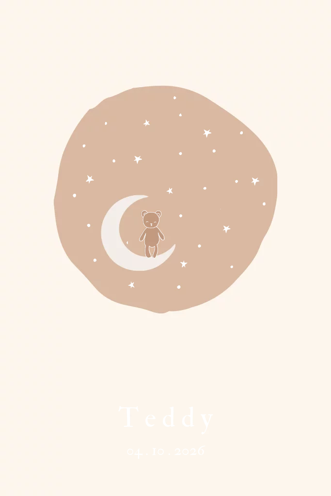 Een lief geboortekaartje met een maan, sterren en teddybeertje op de maan. De lijnen van de teddybeer, babynaam en een paar sterren worden in goudfolie gedrukt.