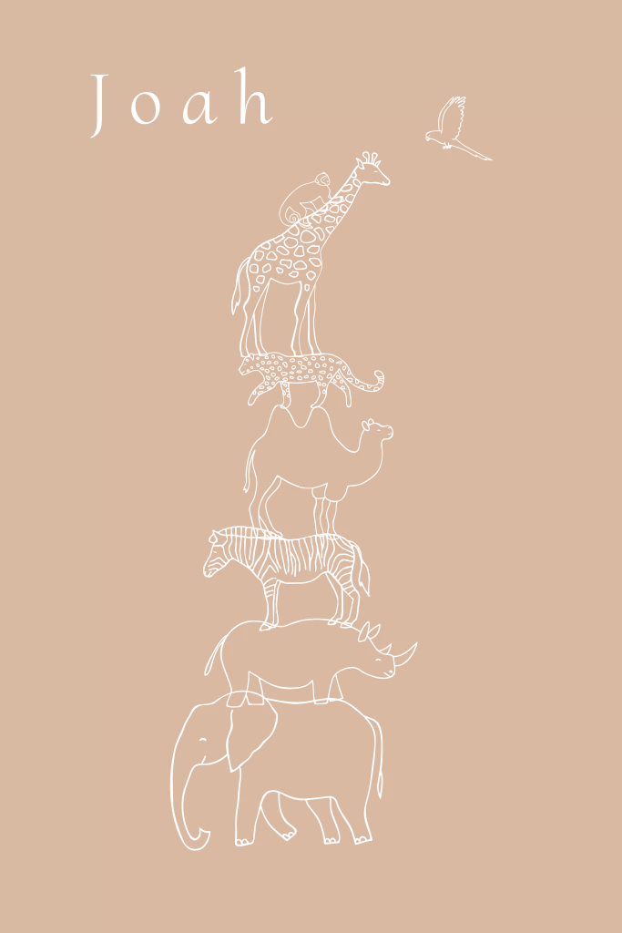 Mooi geboortekaartje met gestapelde dieren; olifant, neushoorn, zebra, kameel, jachtluipaard, giraf, aap en papegaai. Met de babynaam in koperfolie.