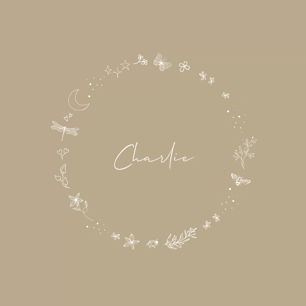 Geboortekaartje met handgetekende tekeningen in rond en goudfolie. Elke afbeelding is apart, dus gemakkelijk te wijzigen naar smaak en om er helemaal persoonlijk kaartje van te maken! (Bij hulp staan we altijd voor je klaar).