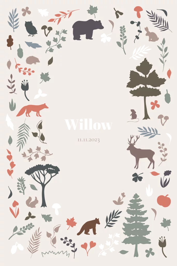 Geboortekaartje herfst met bosdieren, planten, bomen en blaadjes
