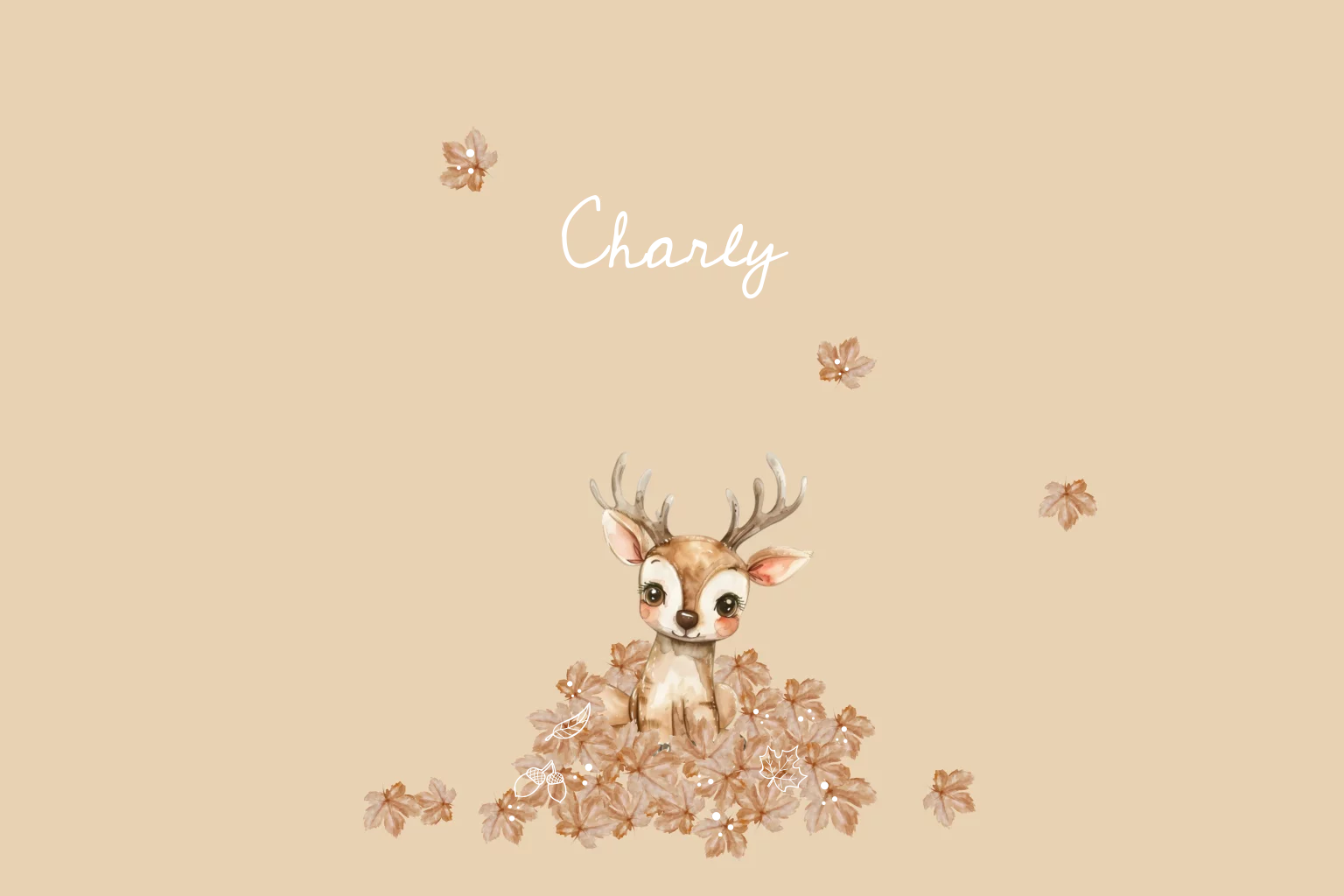 Lief geboortekaartje met een watercolor/aquarel baby hertje in een stapel blaadjes met goudfolie elementen en details.