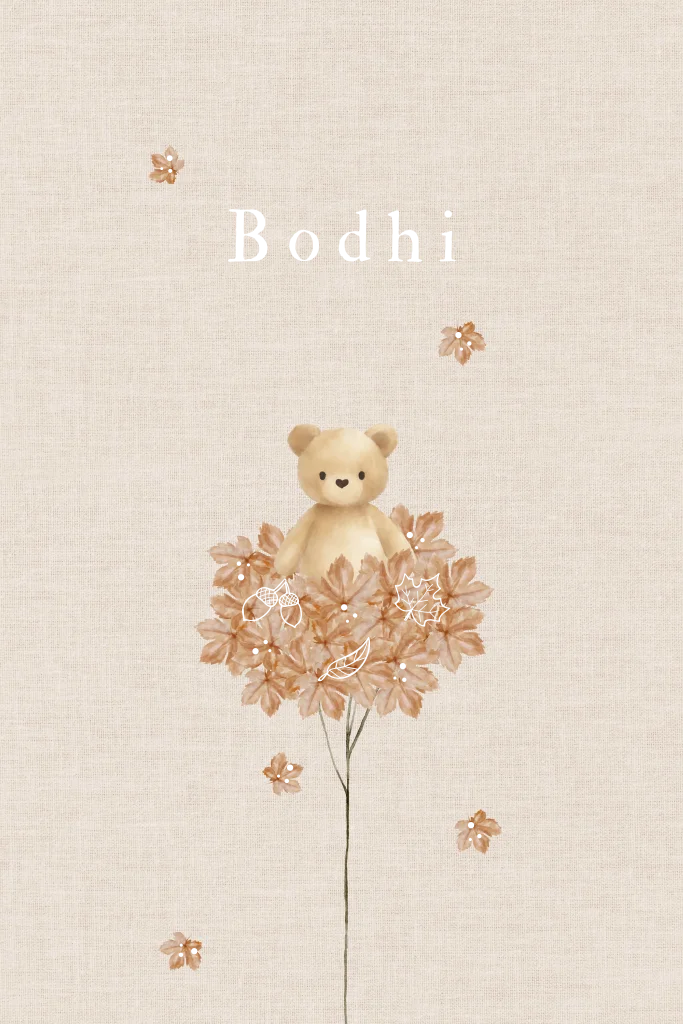 Herfst geboortekaartje met blaadjes en een lief knuffelbeertje in aquarel en goudfolie details in de herfstblaadjes. De achtergrond van dit kaartje heeft een linnenlook, dus kies ook bij het bestellen op 'linnen papier' voor een extra mooi effect!