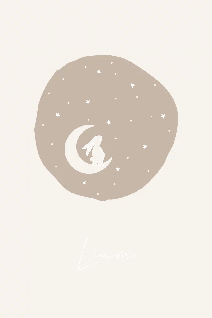 Lief geboortekaartje met knuffelkonijn op de maan en sterren