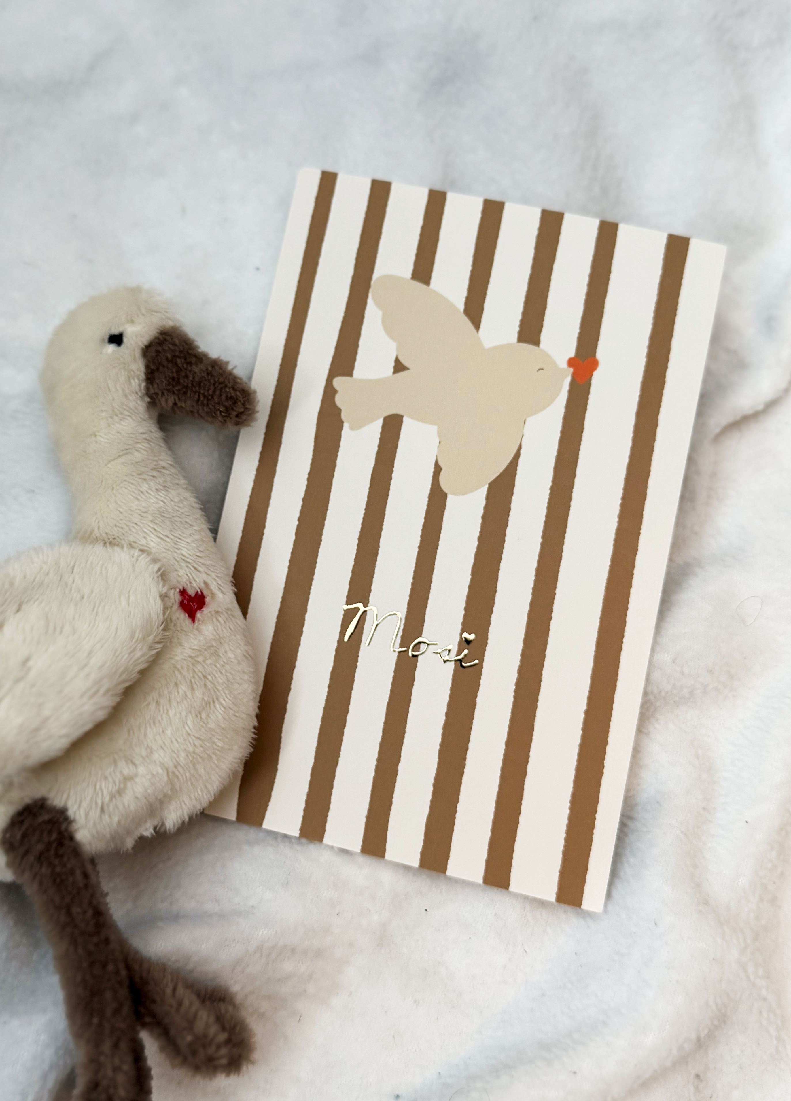 Stoer en lief geboortekaartje met een vogel en een hartje in zijn bek, de naam in goudfolie. Pas gemakkelijk de kleuren en/of folie aan, net zoals al jouw gegevens op dit kaartje. Wil je deze kaart in een ander formaat/vorm of dubbele kaart? Stuur ons een berichtje en wij helpen je graag verder!