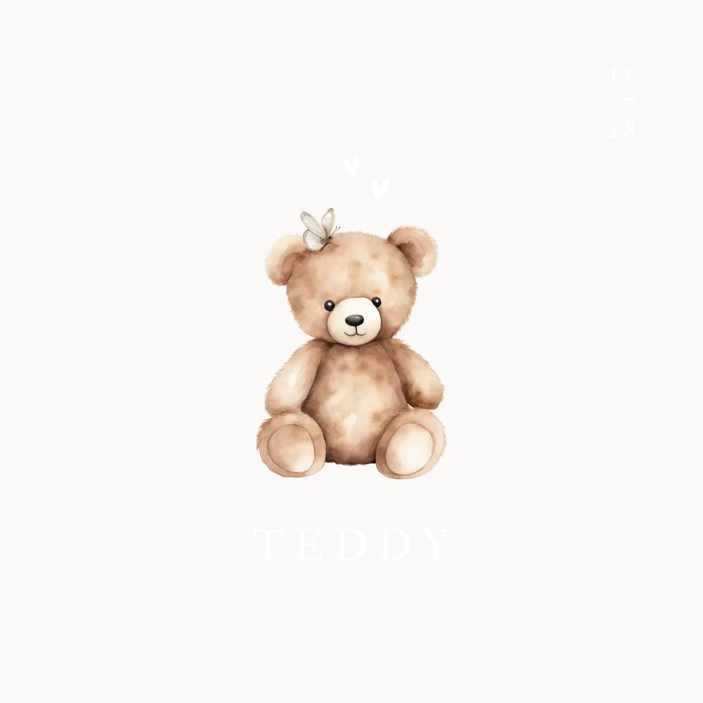 Neutraal geboortekaartje voor zowel meisjes als jongens met een lief aquarel/watercolor knuffelbeertje met hartjes en de naam in goudfolie. Verplaats het vlindertje voor een minder meisjes effect;) hulp nodig? Wij helpen je graag!