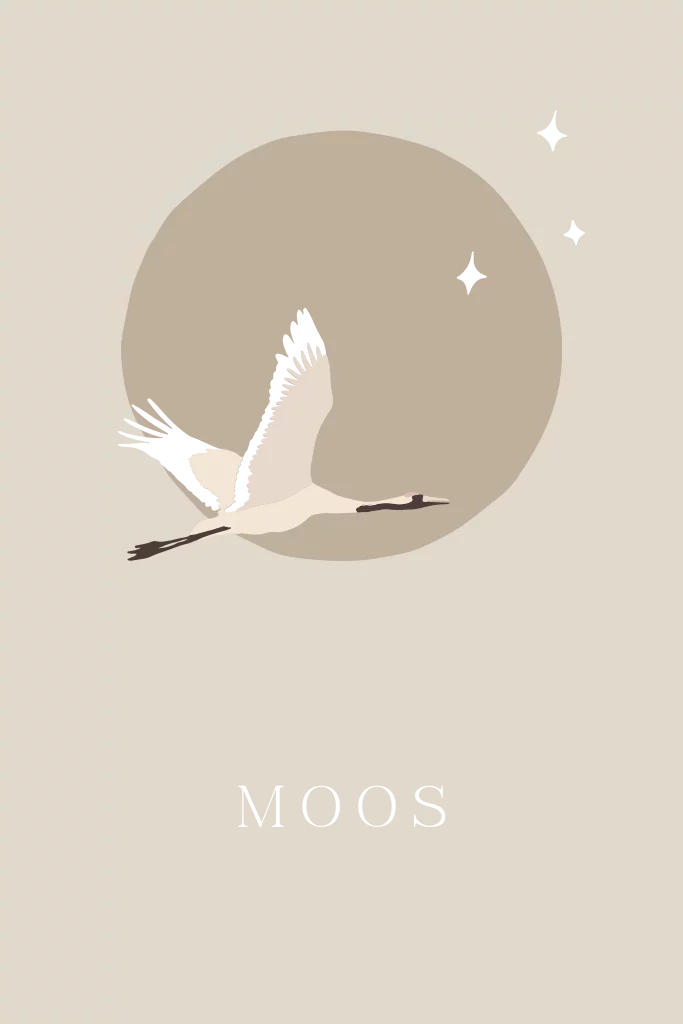 Geboortekaartje kraanvogel stork maan vliegend vleugels goudfolie