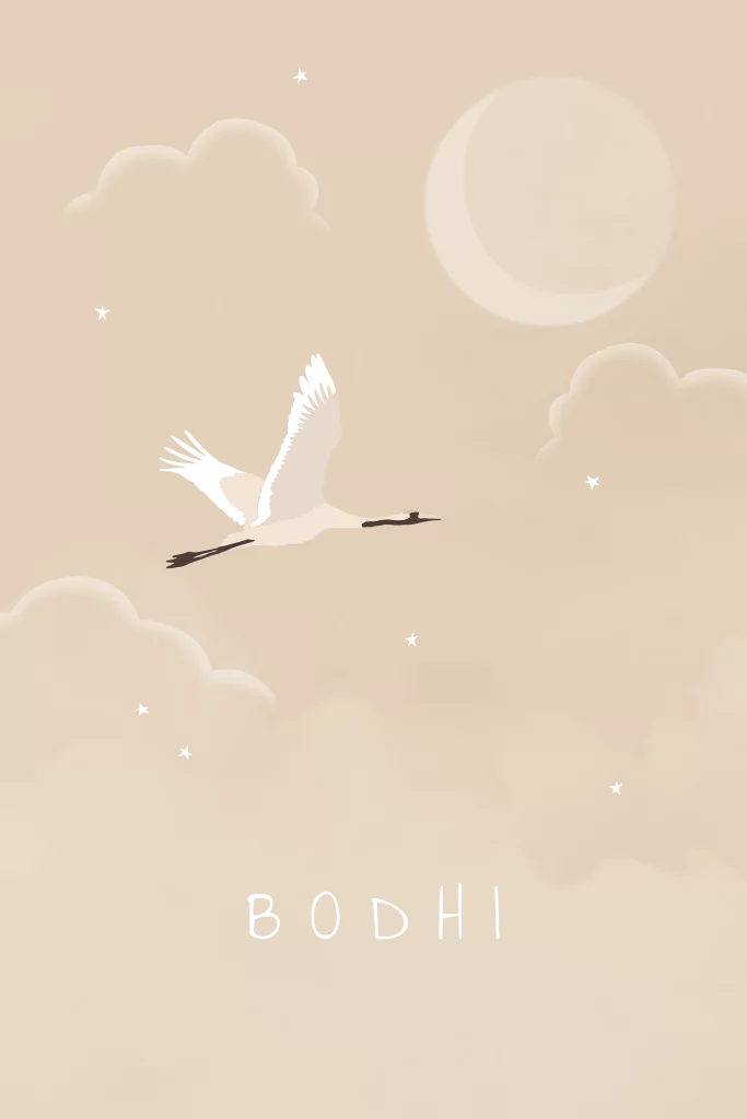 Prachtig geboortekaartje met vliegende kraanvogel in volle maan met goudfolie details. Pas gemakkelijk de kleuren naar wens aan, heb je hulp nodig? Wij helpen je graag!