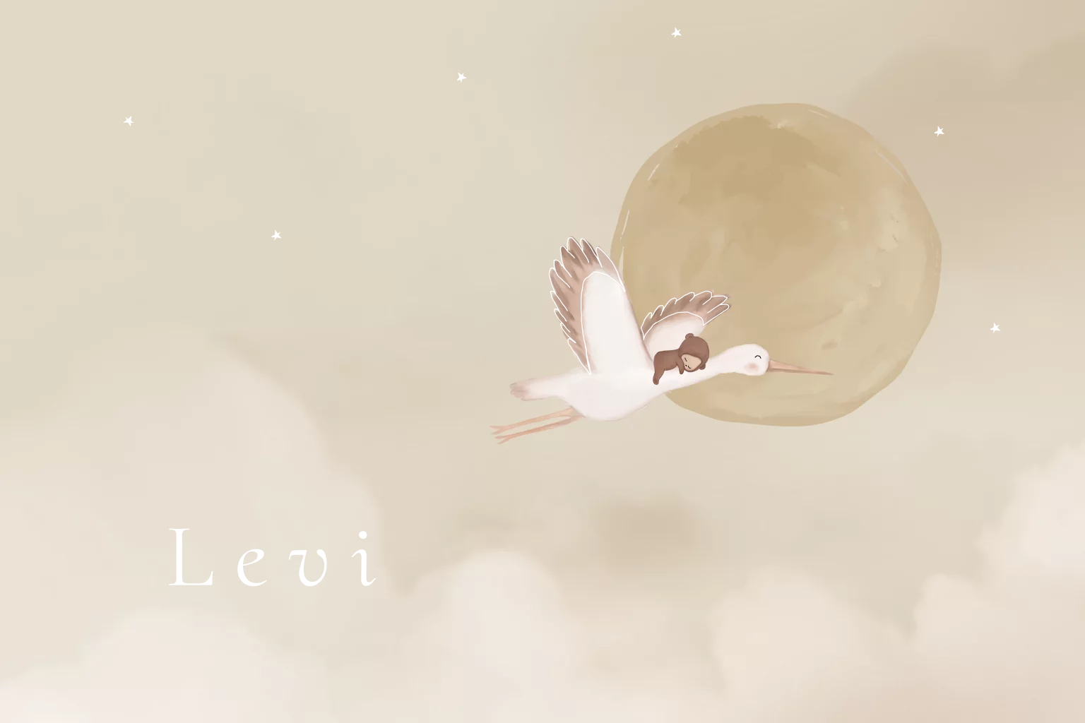 Lief geboortekaartje met handgetekende aqaurel ooievaar en slapende baby met berenpakje op de rug. De omlijning van de vleugels van de ooievaar en sterretjes in de lucht worden gedrukt in goudfolie. Liever andere kleuren en/of folie? Bewerk het met de handige online editor - kom je er zelf niet uit of heb je vragen, wij helpen je graag!