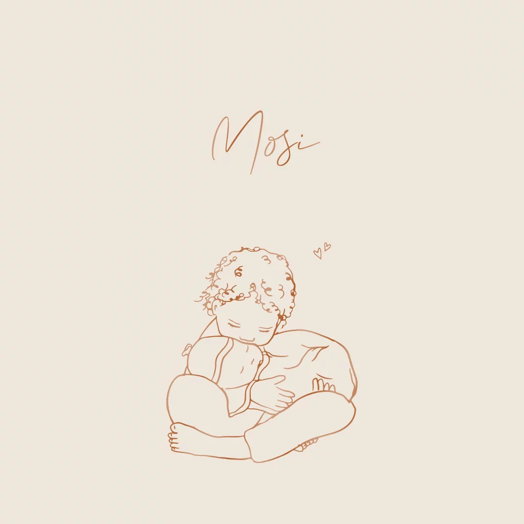 Lief minimalistisch geboortekaartje met mooie lijntekening van een grote broer/zus die zijn/haar zusje/broertje vasthoudt in de armen en een kusje geeft. Kies uit veel verschillende lijntekeningen in de editor - als jouw kindje toch echt ander haar heeft, laat het ons weten en wij passen dit gratis voor je aan op maat!