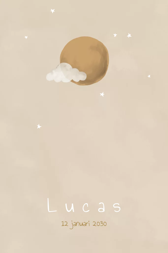Geboortekaartje minimalistisch maan wolk sterren goudfolie